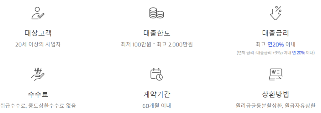 - 최저 100만원 ~ 2000만원까지 연 20% 이내의 금리로 5년간 이용가능