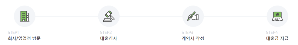홈페이지 열기 > 대출신청 > 이름 및 전화번호 입력 > 상담 > 대출완료